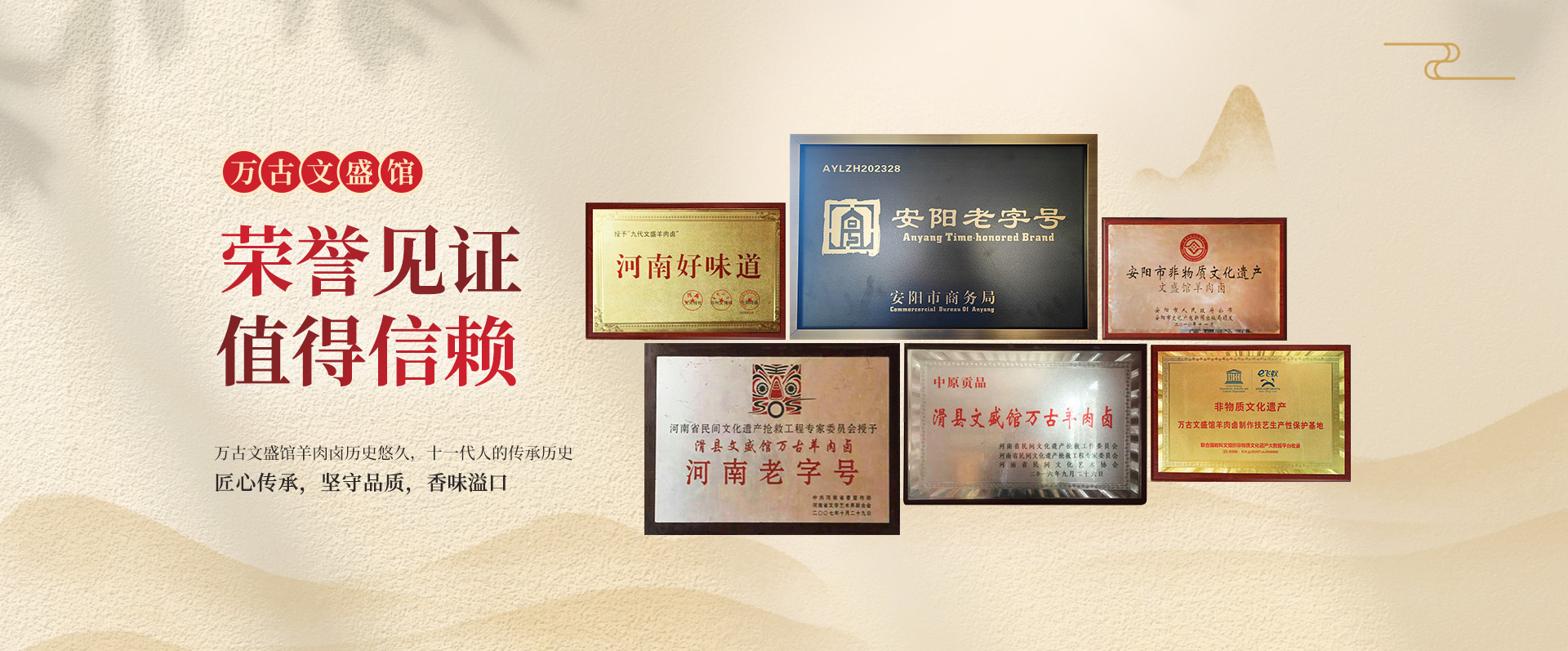 萬古文盛館羊肉鹵,始創于清順治二年(1645年),發源于滑縣萬古鎮梁村集,俗稱“萬古羊肉鹵”,先后歷經王氏家族十幾代人的傳承歷史,逐步積淀成今天的美味佳肴和獨門絕技。萬古文盛館羊肉鹵歷史悠久,內涵豐富,工藝復雜,風味獨特。依靠祖 傳秘方制作,被譽為中原名饈。咸豐年間曾作為宮廷御用貢品。《滑縣志》有“東西南北都吃遍,不如萬古羊肉面”、“隴饌有熊臘,豫烹唯羊鹵”之載述。 王氏家族先人,在“梁王城”(今萬古鎮梁村集)開飯館為生,用羊肉做鹵湯。一天,他在炸制羊油加入大料準備下肉時,一不小心將醋壇打翻在鍋臺,陳年老醋灑入熱油鍋中,隨即油煙沸騰,異香四射,頓時繚繞在大街小巷。這種氣味令人為之一振,隨后,眾人紛紛打探味從何來,并循著氣味來到了王家飯館,大家驚訝之后給以盛贊。王氏先人弄拙成巧,因失誤得法。他遂將羊肉館取名為:“聞盛館”(聞味盛贊之意)。聞盛館常有文人詩客相聚,談天說地,詠詩作對。 一天,乾隆便裝游歷“玉皇閣”時,食欲陡增,饑餓難耐,便問及地方美食,答曰:有一“聞盛館”,常有文人詩友聚之,乾隆隨喚地方官呈至,食后大喜,贊曰:“‘聞盛館’者‘文盛館’也”(文詩墨客盛聚之意)。 從此以后,因乾隆樹名,“萬古文盛館羊肉鹵”自然替代了“聞盛館”之名,而被喚至今。 后來,王氏先人不斷用醋加以調試,并創新了食醋的獨特制作工序和味道,在質量和品位方面,一次次研究總結,直到自己完全滿意為止。這種佐以秘制醋的妙用,使羊肉鹵不僅去除了原有的膻、腥、膩,還使味道芬芳溢口,粘齒留香,更醇更厚——令人回味悠長,久久難忘。